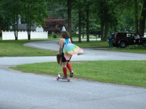 Here's my Billboard Baby scooter-ing throughout the neighborhood, drumming up sales for our yard-sale earlier this year.